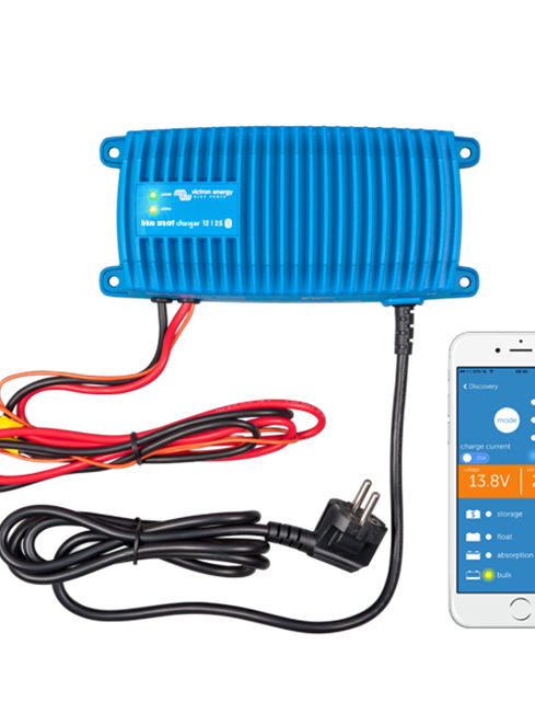 The Blue Smart IP67 Waterproof Charger is the new professional battery charger with built-in bluetooth. The Blue Smart IP67 Waterproof Charger can be used on devices in your workshop and on motor vehicles, such as (classic) cars; motorbikes; boats and camper-vans. The battery is charged, smartly... to perfect condition The seven-step charging algorithm gets the best out of your battery. The charger gives the battery the power it needs, maintains its health, ensures better performance... and a longer life. Recovery of deeply-discharged 'dead' batteries Unlike other brands, the Blue Smart IP67 Charger Waterproof will attempt to recharge a deeply-discharged battery by force-feeding it with a low current. Normal charging will then be resumed as soon as there is sufficient voltage across the battery terminals. Check the status of your battery remotely Blue Smart IP67 Charger Waterproof is equipped with built-in Bluetooth, so the status of the charger and the battery can be checked on a smartphone, tablet or laptop. All settings of the charger can be configured with the VictronConnect app