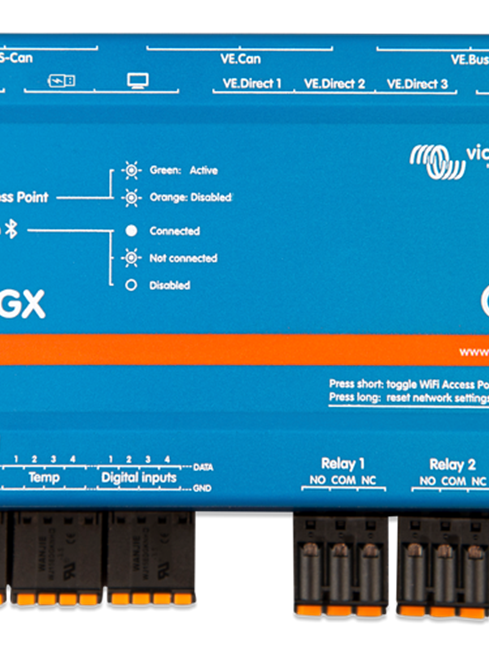 This all-new communication-centre allows you to always have perfect control over your system from wherever you are and maximizes its performance. Simply connect through our Victron Remote Management (VRM) portal, or access directly, using the separate GX Touch 50, a MFD or our VictronConnect app thanks to its added Bluetooth capability. This latest addition to the GX-range combines all the best of connectivity, redefining smart power solutions in every way.