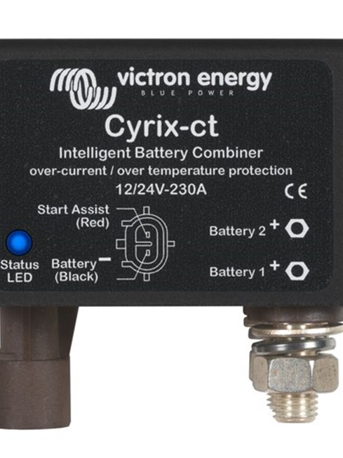 The Cyrix Battery Combiner is a microprocessor controlled heavy duty relay that automatically connects batteries in parallel when one of them has reached a pre-set voltage (indicating that the battery is being charged), and disconnects when the voltage decreases below float level (indicating that one or more batteries are being discharged). Cyrix Battery Combiners are an excellent replacement for diode isolators. The main feature is that there is virtually no voltage loss so that the output voltage of alternators or battery chargers does not need to be increased.