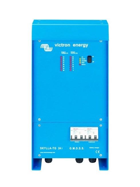 GMDSS - The Global Maritime Distress & Safety System (GMDSS) was developed by the International Maritime Organisation (IMO) to improve maritime distress and safety communications. The Skylla TG has proven itself to be an excellent battery charger and power supply for GMDSS applications. However, when using a standard Skylla charger, additional equipment is needed to perform the monitoring and alarm functions required for GMDSS.The Victron Skylla GMDSS charger has been designed to provide all required monitoring and alarm data. Both the battery and the GMDSS system are connected directly to the charger. Data and alarms are displayed on a digital panel (VE.Net GMDSS panel, to be ordered separately). A standard eight wire UTP cable connects the charger to the panel.