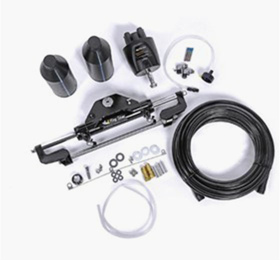 Hydraulic Marine Outboard Steering Kit: SKU: MH-0023-D01(Similar to HK6324) INCLUDES: · MHP-35 Helm · MHP-22 Cylinder · 2 x 1 Liter hydraulic Oil · Hydraulic Hose, 1 x 50ft (comes standard with brass fittings) FEATURES: · Unmatched low friction hydraulic steering system. · Five turns lock-to-lock for single cylinder use. · The MHP-35 front mount helm pump only needs a 3" cutout in the dash · Standard 3/4" Taper shaft on the helm pump SPECIFICATION: · Helm Pump: 1.7 cubic inches · Stainless Steel shaft · 1000 PSI rating for helm and cylinder · Cylinder: 8.36 cubic inches
