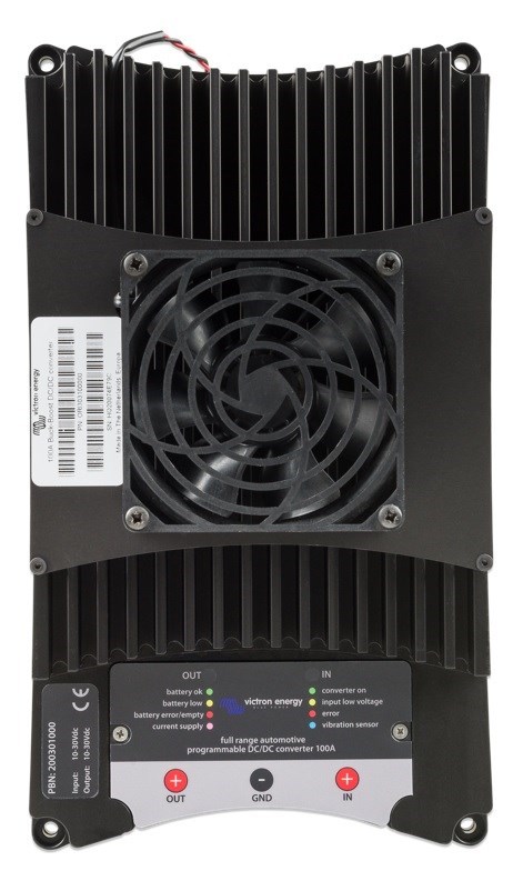 DC-DC Converter for charging a 12/24V service battery in vehicles with an intelligent dynamo. The Buck-Boost DC-DC Converter is a DC-DC converter for charging a 12/24V service battery in vehicles with an intelligent dynamo. Since, when the engine is running, these dynamos (powered by the on-board electronics of Euro 5 and 6 engines) do not always emit the correct charging current, a DC-DC converter is essential for charging the service battery properly. DC-DC Converter for charging a 12V or 24V service battery in vehicles with a smart alternator (regenerative braking, Euro 5 and Euro 6 engines) The Buck-Boost DC-DC Converter is a DC-DC Converter for charging a 12V or 24V service battery in vehicles with a smart alternator. The converter will charge the auxiliary battery with a pre-set charge voltage, eliminating high voltages (e.g. Mercedes: 15,4V) and low voltages. Input voltage range 10-30V Under voltage threshold 10V Output voltage range 10-30V Maximum charge current 12V : 100A and 24V : 50A Power consumption Converter off, LEDs off (power save mode) 7 mA On/off input (pin 1, purple wire) ‘On’ threshold voltage > 2V Maximum input voltage 30V Output pin 1 and pin 2 Output voltage if activated Vpinout = Vin Maximum current (per pin) Ipinout = 1A Operating temperature range -25 +60°C Ambient temperature Max current: up to 60°C Weight 4,1kg Dimensions 288 x 162 x 95mm