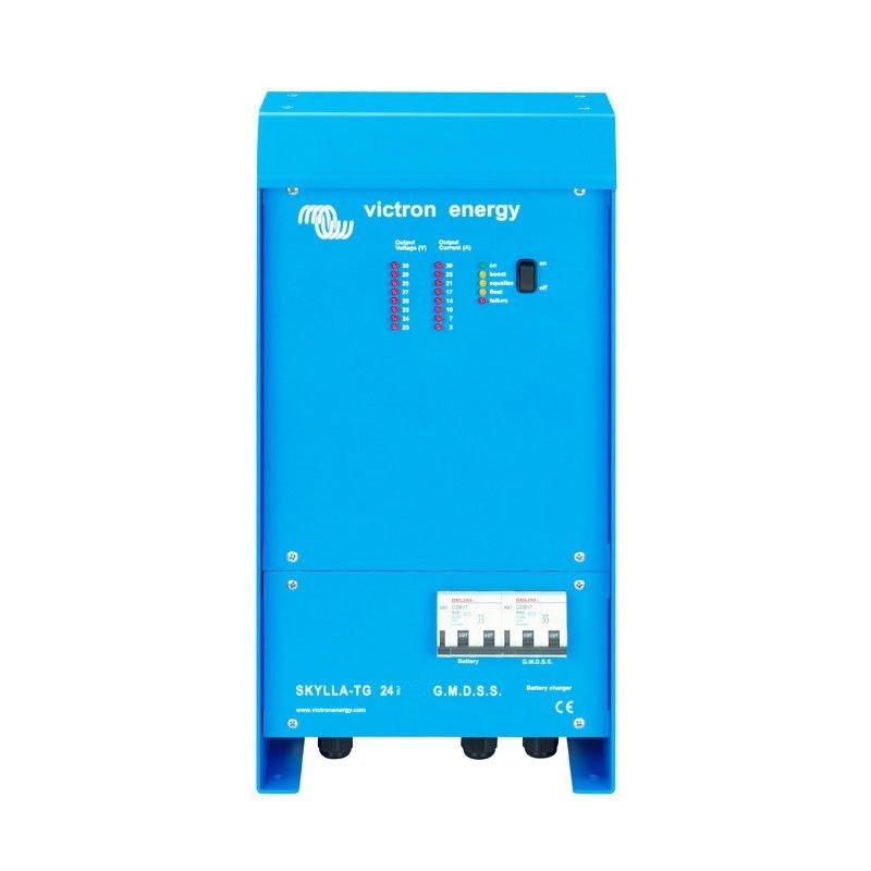 GMDSS - The Global Maritime Distress & Safety System (GMDSS) was developed by the International Maritime Organisation (IMO) to improve maritime distress and safety communications. The Skylla TG has proven itself to be an excellent battery charger and power supply for GMDSS applications. However, when using a standard Skylla charger, additional equipment is needed to perform the monitoring and alarm functions required for GMDSS.The Victron Skylla GMDSS charger has been designed to provide all required monitoring and alarm data. Both the battery and the GMDSS system are connected directly to the charger. Data and alarms are displayed on a digital panel (VE.Net GMDSS panel, to be ordered separately). A standard eight wire UTP cable connects the charger to the panel.